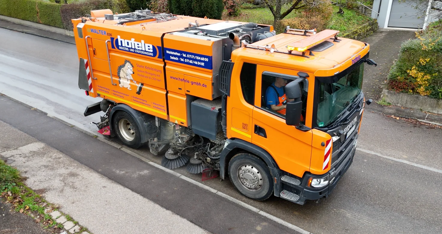 Mit unserer wendigen Großraumkehrmaschine reinigen wir großflächig und auf Wunsch porentief Straßen, Wege und Parkflächen. Mit zwei Tellerbesen und quer liegenden Kehrbesen kann eine gereinigte Breite bis 350 cm in einem Durchgang.